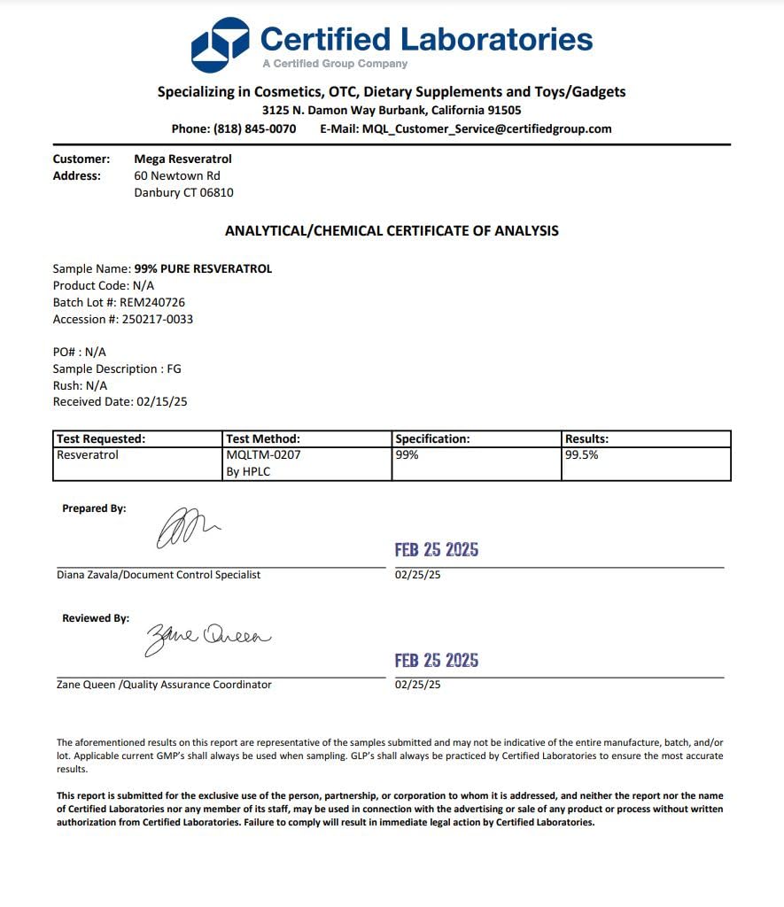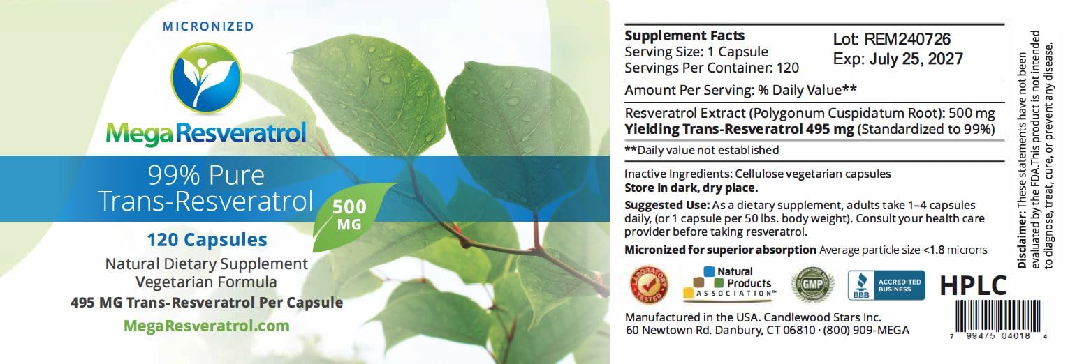 Mega Resveratrol is a pharmaceutical-grade, 99% PURE, ISOLATE, MICRONIZED, TRANS-Resveratrol. A 500mg capsule provides 495 mg of bioactive TRANS-resveratrol. WHAT IS PURE RESVERATROL? Resveratrol is a general name for a product that is available in various purities: 5%, 10%, 20%, 50%, and 99%. PURE Resveratrol refers to a product that (should) contain only TRANS-Resveratrol, the ACTIVE, and BENEFICIAL substance of the plant (Japanese-knotweed, grapes, etc.). MegaResveratrol.net was a pioneer in introducing high potency resveratrol products and setting the standards of voluntary third-party independent lab testing for purity and safety. We offer premium-grade natural resveratrol supplements in vegetarian capsules and powder forms. Mega Resveratrol is a proud supplier of resveratrol products to various research clinics, and universities, and has been used in over 50 published studies. https://scholar.google.com/scholar?start=0&q=mega+resveratrol&hl=en&as_sdt=0,7